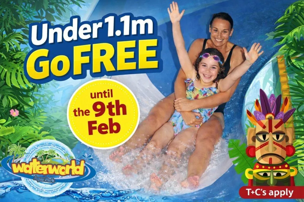 - One child under 1.1m tall can go free at Waterworld Aqua Park with each full-paying adult until 9th February 2026. Children under 1.1m tall must be closely supervised in the water at all times by a responsible adult aged 18 or over. Children will have their height measured at Reception before being granted admission to the Aqua Park; if they are over 1.1m tall, you will need to purchase tickets at the normal rate for them.